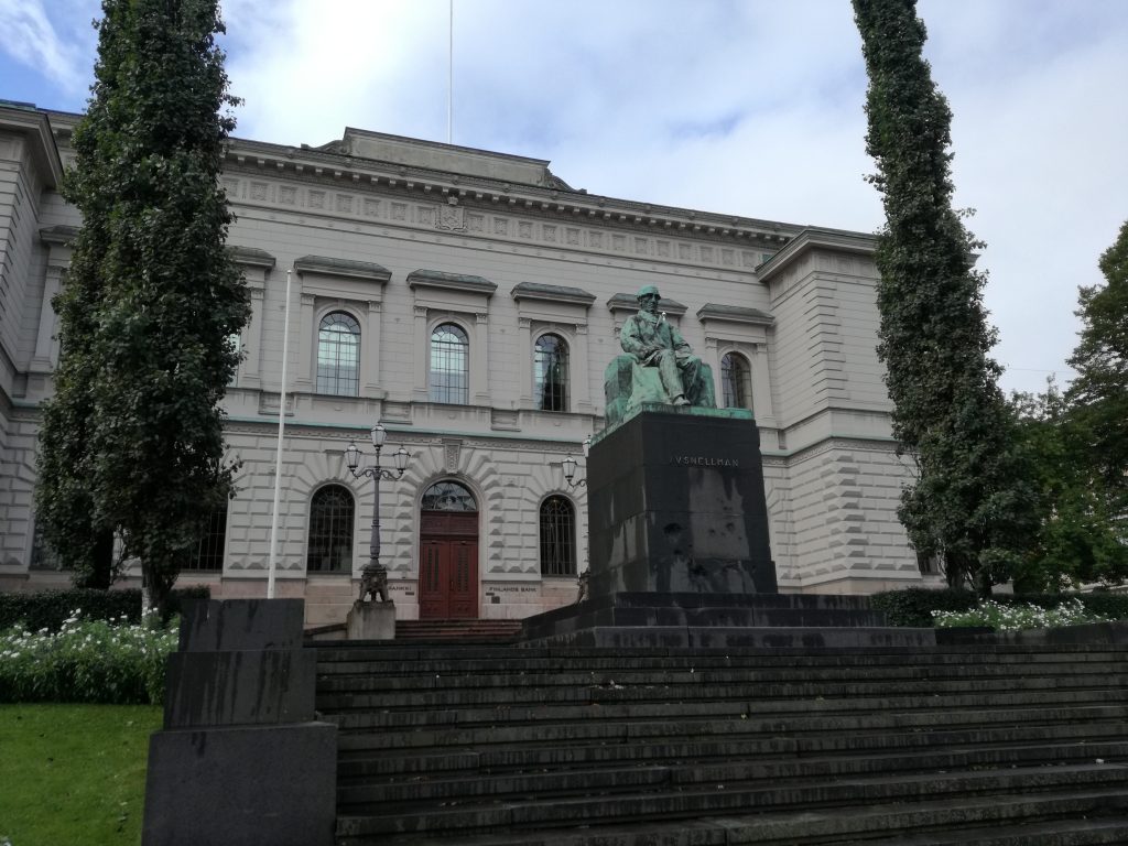 Few hundred meters south of Metsatalo is the heart of the Finnish governments. In front of the Bank of Finland lies a statue of J. V. Snellman, a central figure in the rise of Finnish nation as well as Finnish economy during Grand Duchy era. This statue acts as dual layer monument such that it shows the history of the Finnish nation, but also the suffering it went through after her independence. Large dent made by Soviet autocannons are very visible on the pedestal. Intentional “preservation” of the holes show the political motive behind the dual-layer.