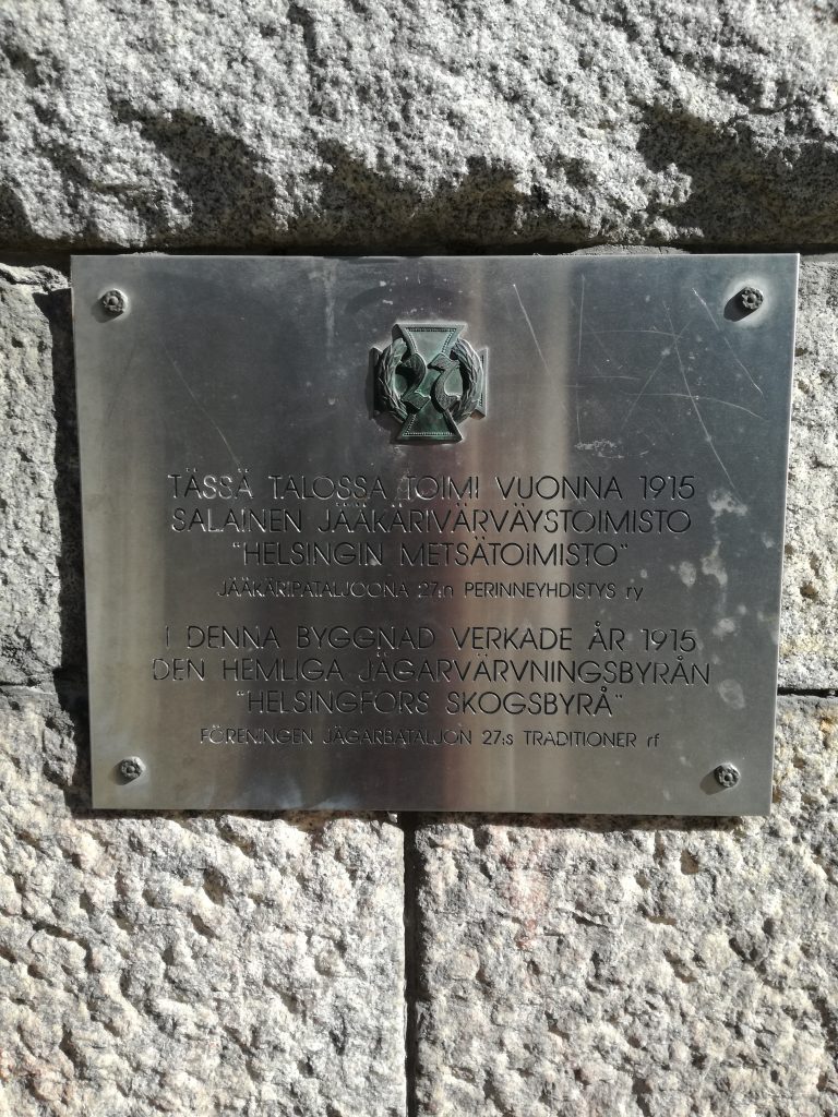 The building on Liisankatu 17, with marks of cannon fire, once housed an recruiting office of WWI era Finnish volunteers for German Army’s Jaeger battalion (27th Royal Prussian Jaeger Battalion), under the clandestine name of Helsinki Forestry Office. The Jaegers, mostly university students, played a significant role in the White victory of civil war, but not much traces can be seen in Helsinki except for cemeteries. This small plate tells the story of the Jaegers that were recruited from Helsinki area.