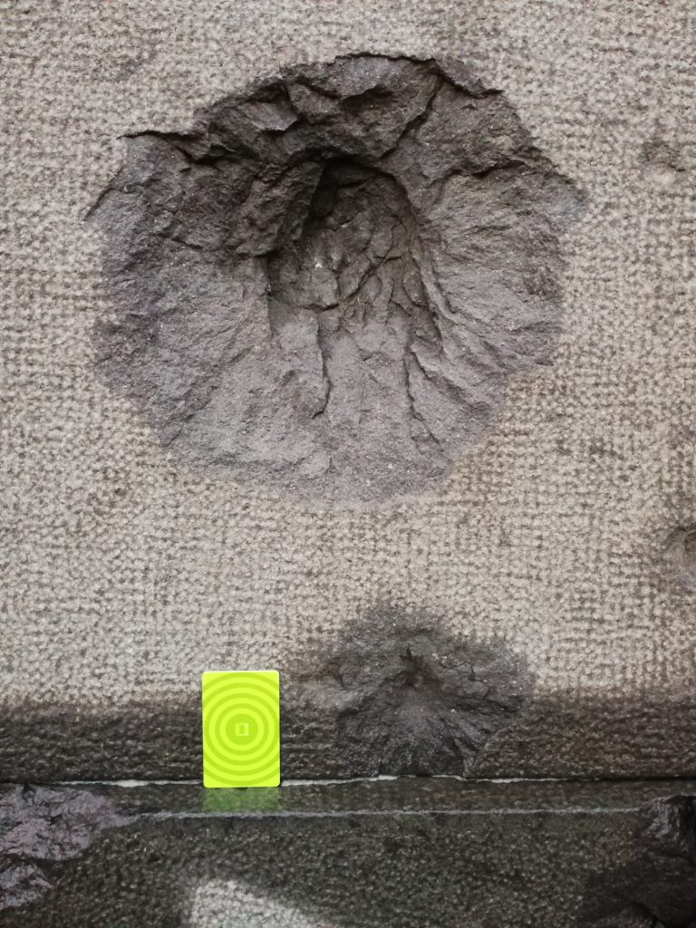 One of several marks on the pedestal, a HSL travel card for comparison. Likely a large-caliber cannon fire.